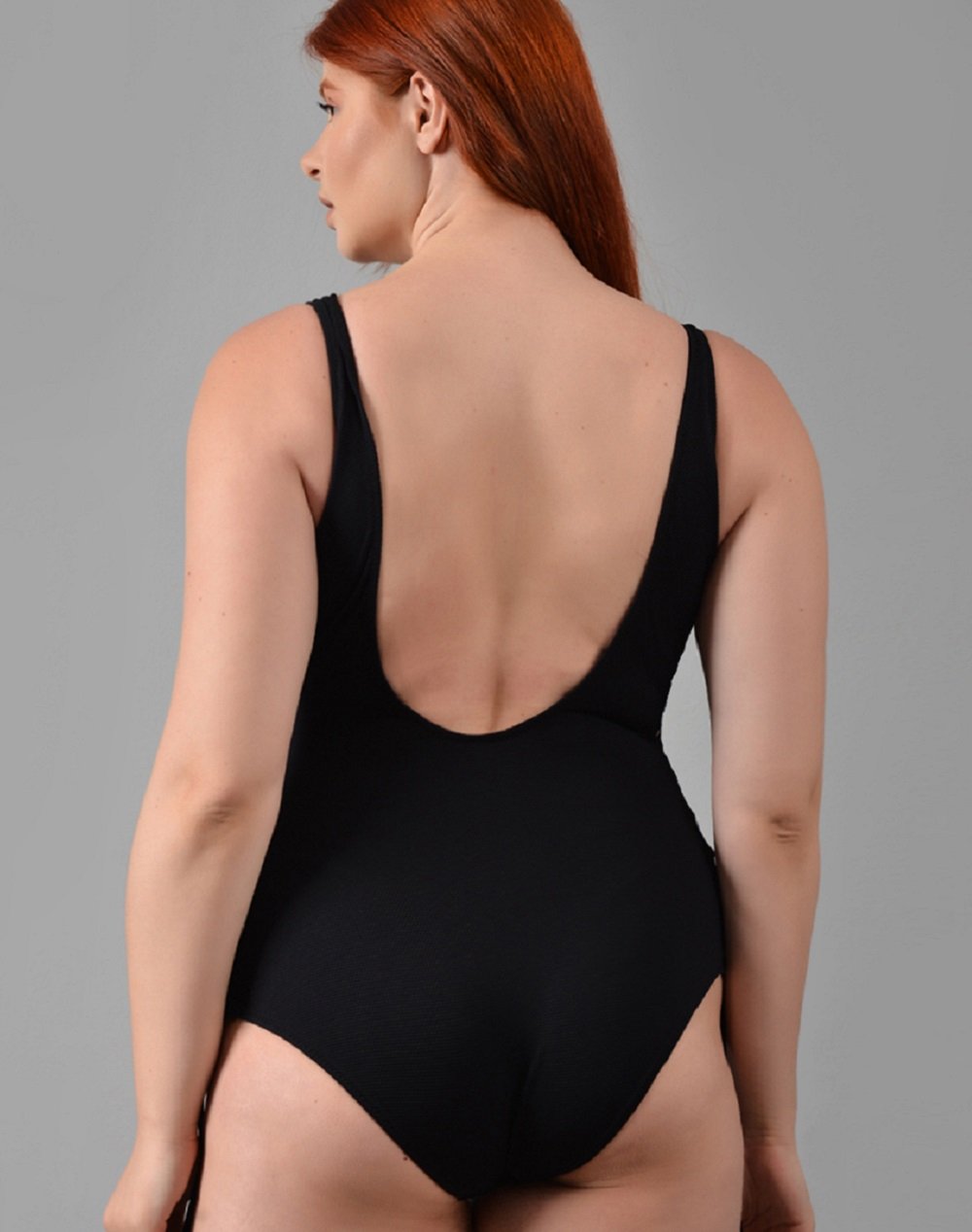 Ολόσωμο plus size από πικέ lycra με αποσπώμενα cups και άνοιγμα που αυξομειώνεται στα πλαϊνά.
